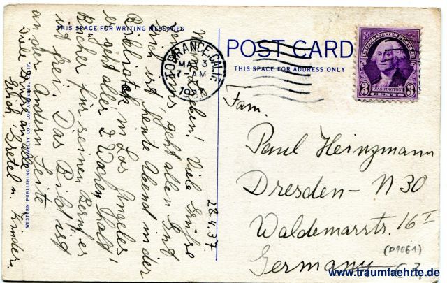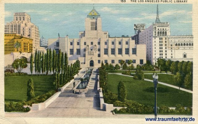 – Details – Jahr: ca. 1930 Status: gelaufen 1937 Beschriftung vorne: 153 The Los Angeles Public Library, 1A-H416 Beschriftung hinten: Post Card, This space for address only, This space for writing messages, Western Publishing Novelty Co., Los Angeles, Calif. Stempel: Torrance.Calif. MAY 3, 7 – am, 1937; ~~~ Hinweis: