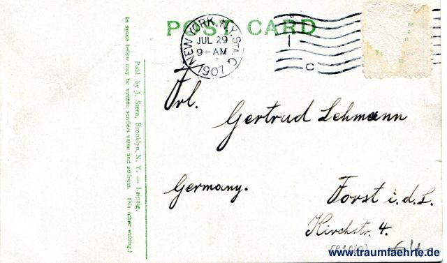 – Details – Jahr: ca. 1900 Status: gelaufen 1907, Briefmarke entfernt Beschriftung vorne: Herald Square and Times Building, New York, Lucis Pearls,... Beschriftung hinten: Post Card, Publ by J. Stern, Brooklyn, N. Y. – Leipzig. in space below may be written senders name and address. (No other writing.) Stempel: New York.N.Y.Sta.C, JUL 29, 9 – am, 1907 Hinweis: