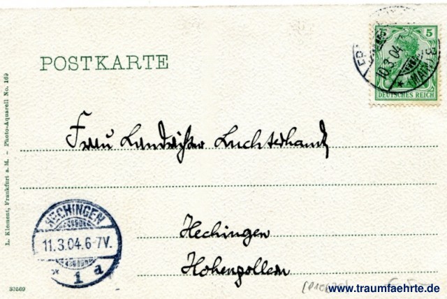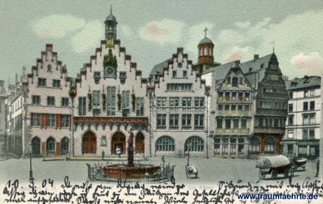 – Details – Year: ca. 1900 Postal state: postally used 1904 Inscription front: Frankfuirt a. M. Der Römer Inscription back: Postkarte, L. Klemert, Frankfurt a. M. – Photo-Aquarell No. 169, 30569 Postmark(s): Fr(ankfurt) (Main), 8, (...), 10.3.04 (...); Hechingen, 1, a, 11.3.04.6-7V. Please note:
