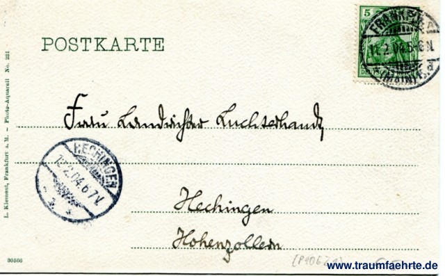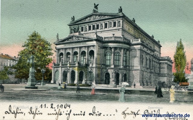 – Details – Year: ca. 1900 Postal state: postally used 1904 Inscription front: Frankfurt a. M. Opernhaus Inscription back: Postkarte, L. Klemert, Frankfurt a. M. – Photo-Aquarell No. 231, 30566 Postmark(s): Frankfurt (Main), (...), a, 11.2.04.5-6N.; Hechingen, (...), 12.2.04.6-7V. Please note: