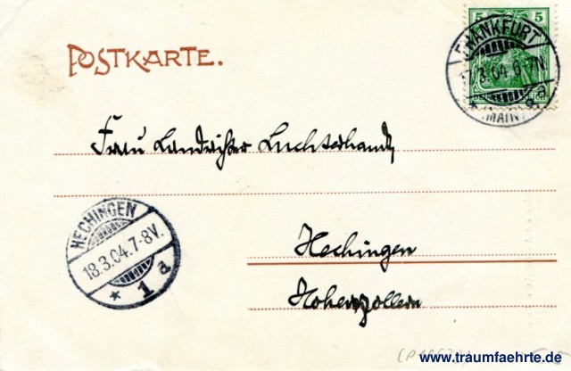 – Details – Year: ca. 1900 Postal state: postally used 1904 Inscription front: Frankfurt a. M. Blick auf Altermarkt. Dom. 67339 Schaar & Dathe Trier Inscription back: Postkarte. Postmark(s): Frankfurt (Main), 8, a, 17.3.04.6-7N.; Hechingen, 1, a, 18.3.04.7-8V. Please note: