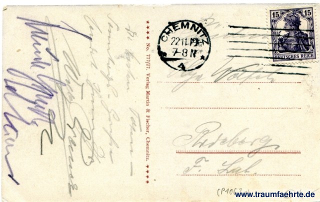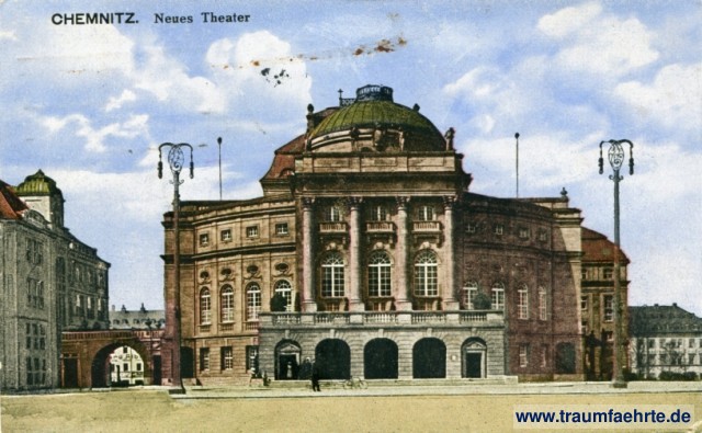 – Details – Year: ca. 1915 Postal state: postally used 1919 Inscription front: Chemnitz. Neues Theater Inscription back: **** No. 777/27. Verlag Martin & Fischer, Chemnitz. **** Postmark(s): Chemnitz, 22 11 (19), 7-8 N, 4; --- Please note: