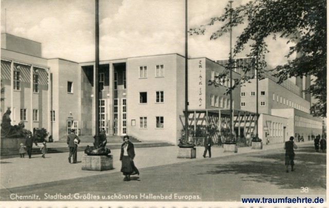 – Details – Year: ca. 1935 Postal state: postally unused Inscription front: Chemnitz, Stadtbad. Größtes u. schönstes Hallenbad Europas. 38 Inscription back: Echte Photographie, Verlag: W. Wagler, Chemnitz, Zschopauer Str. 181 Postmark(s): none Please note: