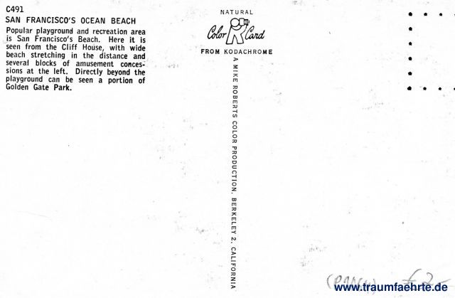 – Details – Jahr: ca. 1950 Status: ungelaufen Beschriftung vorne: kein Text Beschriftung hinten: C491 San Francisco's Ocean Beach, Popular playground and recreation area is San Francisco's Beach. Here it is seen from the Cliff House, with wide beach stretching in the distance and several blocks of amusement concessions at the left. Directly beyond the playground can be seen a portion of Golden Gate Park. Natural Color Card from Kodachrome, A Mike Roberts Color Production. Berkeley 2, California Stempel: keine Hinweis: