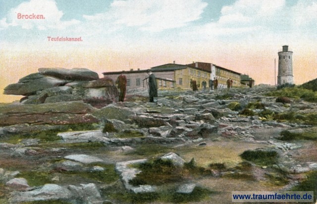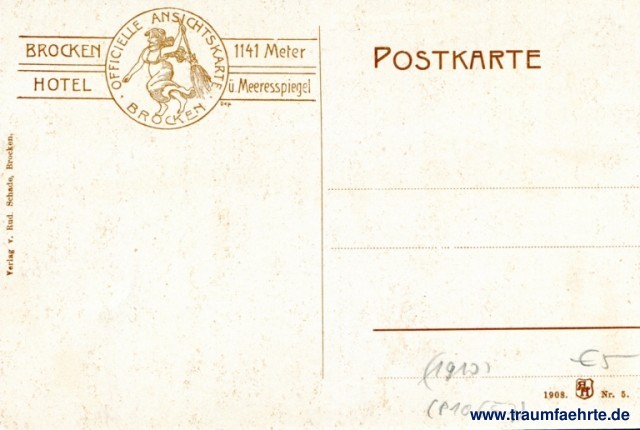 – Details – Year: 1908 Postal state: postally unused Inscription front: Brocken. Teufelskanzel. Inscription back: Postkarte, Officielle Ansichtskarte, Brocken, Brocken Hotel, 1141 Meter ü. Meeresspiegel, Dep, Verlag v. Rud. Schade, Brocken, 1908. R H, Nr. 5. Postmark(s): none Please note: