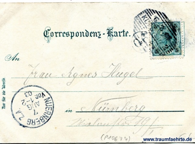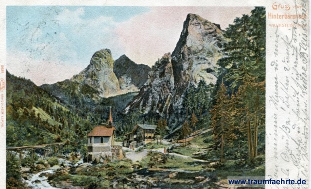 – Details – Jahr: ca. 1900 Status: gelaufen 1903 Beschriftung vorne: Gruss vom Hinterbärenbad b/Kufstein, Tirol, 2639 Auto-Chrom, Louis Glaser Leipzig. Beschriftung hinten: Correspondenz-Karte. An ... in ... Nur für die Adresse. Stempel: Kufstein 2, 6. 8. 03; (96); Nuernberg, 7 Aug. Vor. 1-2 03 Hinweis: