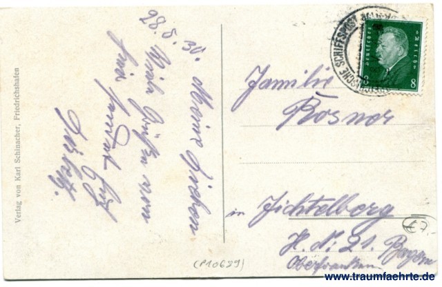 – Details – Jahr: ca. 1925 Status: gelaufen 1930 (Schiffspost) Beschriftung vorne: Friedrichshafen, total Beschriftung hinten: Verlag von Karl Schumacher, Friedrichshafen Stempel: Oesterreichische Schiffspost, 8.V.30 (...) Hinweis: