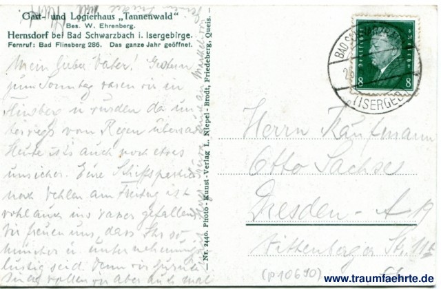 – Details – Jahr: ca. 1925 Status: gelaufen 1929 Beschriftung vorne: Gast- u. Logierhaus Tannenwald, Bad Schwarzbach i. Isergeb. Beschriftung hinten: Gast- und Logierhaus Tannenwald, Bes. W. Ehrenberg. Hernsdorf bei Bad Schwarzbach i. Isergebirge. Fernruf: Bad Flinsberg 286. Das ganze Jahr geöffnet. Stempel: Bad Schwarzbach (Isergeb), 25.6.29.15-16 Hinweis: