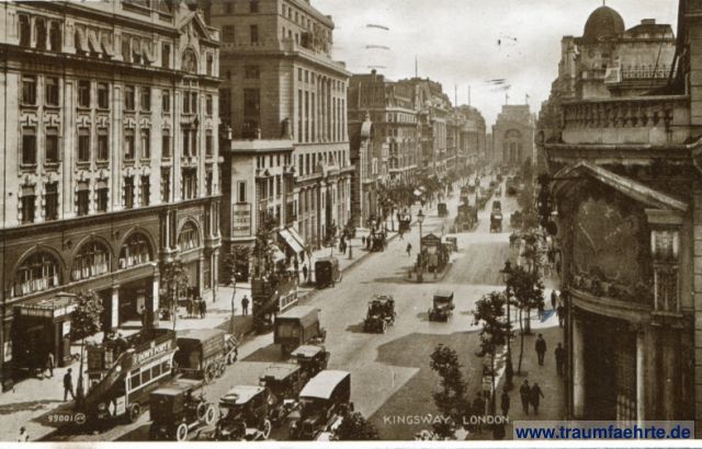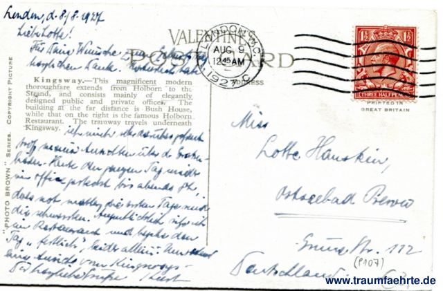 – Details – Jahr: ca. 1925 Status: gelaufen 1927 Beschriftung vorne: 99001 d.V, Kingsway, London. Beschriftung hinten: Valentine's Post Card, Kingsway. – This magnificent modern thoroughfare extends from Holborn to the Strand, and consists mainly of elegantly designed public and private offices. The building at the far distance is Bush House, while that on the right is the famous Holborn Restaurant. The tramway travels undeneath Kingsway. Photo Brown Series. Copyright Picture, Printed in Great Britain Stempel: London W.C. Aug 9, 12 45am, 1927 C Hinweis: