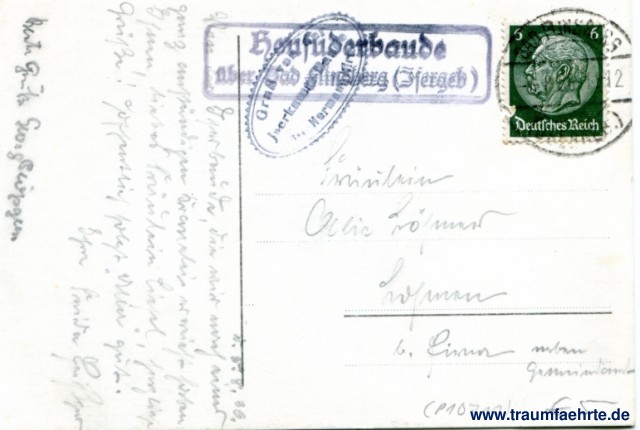 – Details – Jahr: ca. 1935 Status: gelaufen 1936 Beschriftung vorne: Iser-Gebirge. Iserkammbaude u. Kammhäuser. (1002m), RT 331 Beschriftung hinten: kein Text Stempel: Bad Flinsberg (Isergeb.), -5.8.36 11-12; Heufuderbaude über Bad Flinsberg (Isergeb); Gruß von der Iserkammbaude, Bes. Hermann (...) Hinweis: