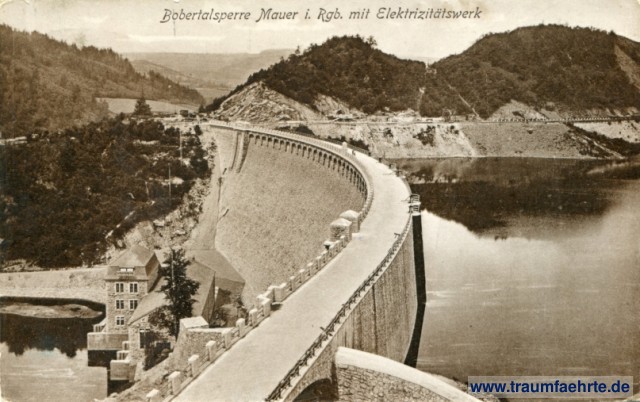 – Details – Jahr: ca. 1910 Status: gelaufen (Bahnpost) Beschriftung vorne: Bobertalsperre Mauer i. Rgb. Mit Elektrizitätswerk Beschriftung hinten: Bobertalsperre bei Mauer a. Bober (größte Sperre Europas). Mauerlänge unten 120 m, oben 280 m, Mauerbreite 51 m W 7,2 , Mauerhöhe 60 m. Staubecken ca. 9 km lang, faßt über 50 Millionen cbm Wasser. Der normale Stand wird auf zirka 30 Millionen cbm gehalten. Kosten der Gesamtanlage einschließlich Elektrizitätswerk zirka 10 Millionen Mark.Diese Karte ist a.d. Bobertalsperre Mauer bekauft, Paul Kaworek, Kasinowirt Stempel: Breslau – (...), Z. (...) Hinweis: