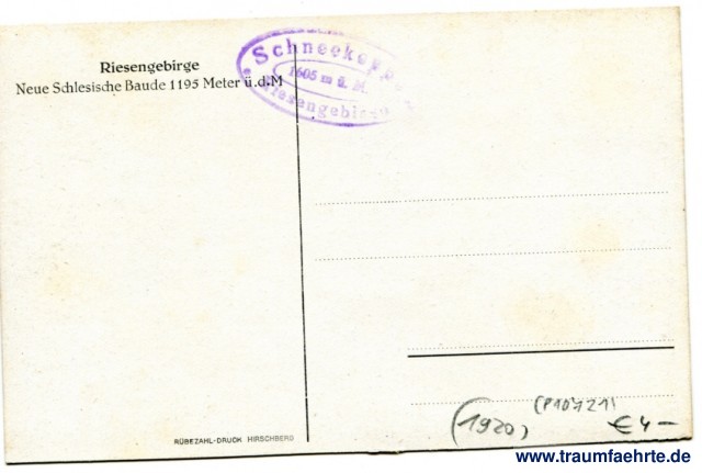 – Details – Jahr: ca. 1920 Status: ungelaufen Beschriftung vorne: kein Text Beschriftung hinten: Riesengebirge, Neue Schlesische Baude 1195 Meter ü. d. M, Rübezahl-Druck Hirschberg Stempel: Schneekoppe, Riesengebirge, 1605 m. ü. M. Hinweis: