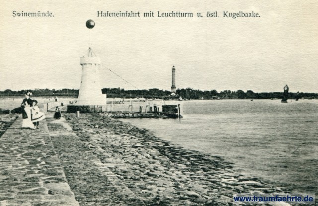 Beschriftung vorne: Swinemünde. Hafeneinfahrt mit Leuchtturm u. östl. Kugelbaake.
