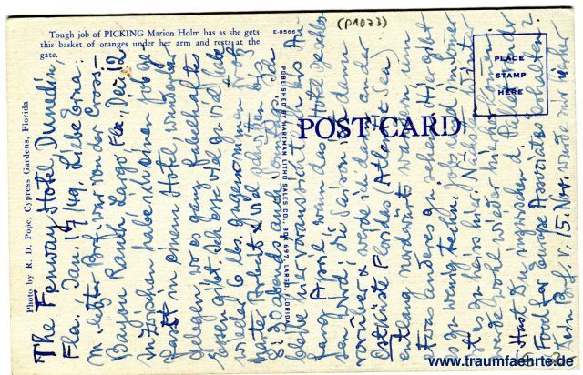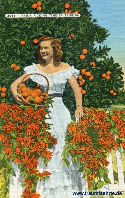 – Details – Jahr: ca. 1945 Status: ungelaufen Beschriftung vorne: 2064 Fruit picking time in Florida Beschriftung hinten: Post Card, Place stamp here, Tough job of PICKING Marion Holm has as she gets this basket of oranges under her arm and rests at the gate. E-8566, Photo by R. D. Pope, Cypress Gardens, Florida, Published by Hartman Litho Sales Co., Box 697, Largo, Florida Stempel: keine Hinweis: