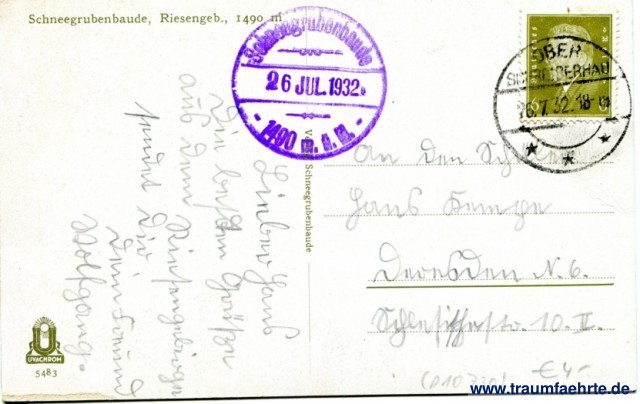 – Details – Jahr: ca. 1930 Status: gelaufen 1932 Beschriftung vorne: kein Text Beschriftung hinten: Schneegrubenbaude, Riesengeb., 1490 m, U Uvachrom, 5483, Verlag Schneegrubenbaude Stempel: Oberschreiberhau, ***, 26.7.32.18-19; Schneegrubenbaude, 1490 m.ü.M. 26 Jul 1932 Hinweis: