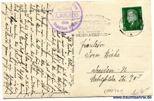 – Details – Jahr: ca. 1925 Status: gelaufen 1930 (Schiffspost) Beschriftung vorne: 119 Beschriftung hinten: Cobra vor Helgoland, Verlag Georg Stilke, Hamburg. Nr. 119 Stempel: Helgoland, 17.8.30, 17-18, *; Auf hoher See an Bord des Dampfers Cobra, 17. Aug 1930 Hinweis: