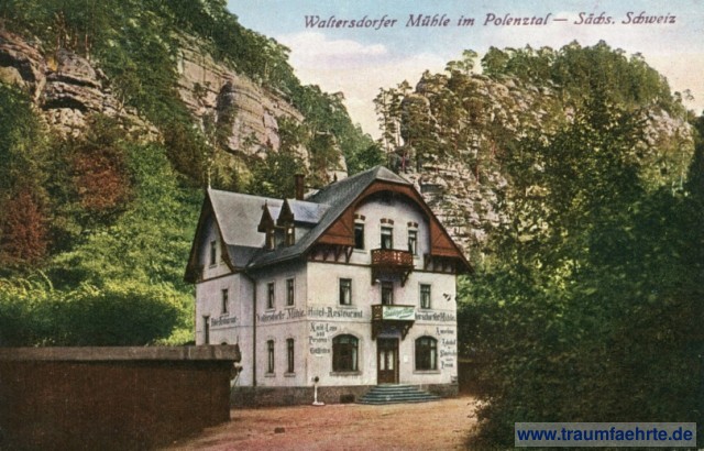 – Details – Jahr: ca. 1920 Status: ungelaufen Beschriftung vorne: Waltersdorfer Mühle im Polenztal – Sächs. Schweiz, Hotel-Restaurant Waltersdorfer Mühle, ... Beschriftung hinten: 6616 Kunstverlag Alwin Keil, Dresden-A. 1, Gerichtsstr. 23 Stempel: keine Hinweis: