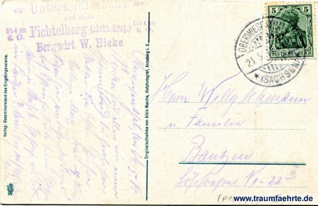 – Details – Year: ca. 1910 Postal state: postally used 1914 Inscription front: Oberwiesenthal i. Erzgeb. Fichtelberg-Unterkunftshaus. 1214 m Inscription back: Verlag: Gesamtvorstand des Erzgebirgsvereins. Originalaufnahme von Albin Meiche, Hofphotograf, Annaberg i. E. Postmark(s): Oberwiesenthal (Sachsen), 24.5.14 4-5N; Unterkunftshaus auf dem Fichtelberg (sächs. Erzg.), Bergwirt W. Hieke (...) m ü. M., (...) Please note: