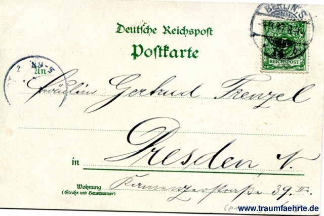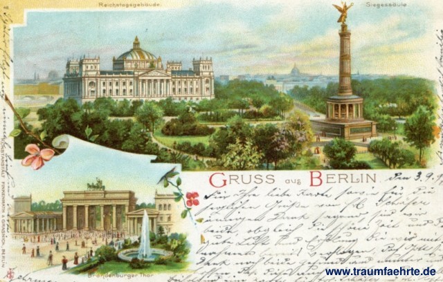 – Details – Jahr: ca. 1895 Status: gelaufen 1897 Beschriftung vorne: Gruss aus Berlin. Reichstagsgebäude. Siegessäule. Brandenburger Thor, 48, Kunstanstalt Finkenrath & Grasnick, Berlin Beschriftung hinten: Deutsche Reichspost, Postkarte, An... in ... Wohnung (Straße und Hausnummer) ... Stempel: Berlin, S, 14, b, 4.9.97 8-9V Hinweis: