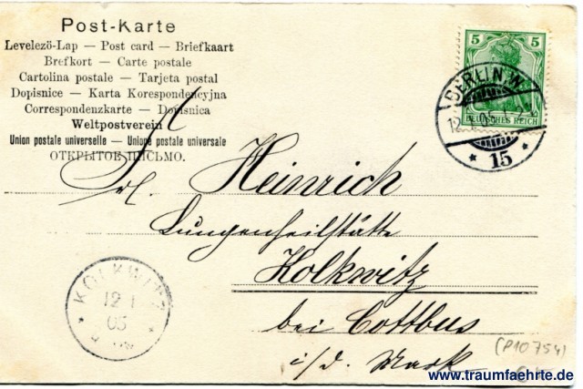 – Details – Jahr: 1904 Status: gelaufen 1905 Beschriftung vorne: Berlin. Am Kanal im Thiergarten. 597 L. Saalfeld, Berlin S.W.29. 1904. Beschriftung hinten: Post-Karte, Levelezö-Lap – Post card – Briefkaart, Brefkort – Carte postale, Cartolina postale – Tarjeta postal, Dopisnice – Karta Korespondencyjna, Correspondenzkarte – Dopisnica, Weltpostverein, Union postale universelle – Unione postale universale, Открытое письмо. Stempel: Berlin.W. * 15 *, 12.1.05.1-2N; Kolkwitz, 12 1 05, (...) Hinweis: