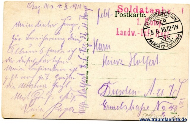– Details – Jahr: ca. 1915 Status: gelaufen ohne Briefmarke (Feldpost), 1916 Beschriftung vorne: Rappoltsweiler mit den Schlössern. Ulrichsburg. Giersberg, Hoh-Rappoltstein Beschriftung hinten: Postkarte. Verlag von Emil Hartmann, Strassburg i. E. 28499 Stempel: Soldatenbrief 1. Komp. Landw.-Inf. Regt.; Feldpostexpedition der Ersatz-Division, XIX. -5.6.16.12-1N Hinweis: