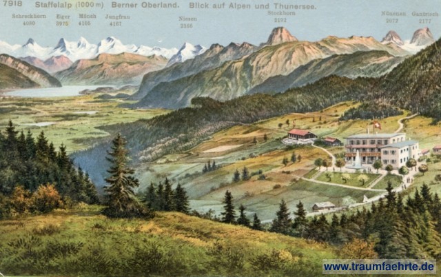 – Details – Jahr: ca. 1920 Status: ungelaufen Beschriftung vorne: 7918 Staffelalp (1000 m) Berner Oberland. Blick auf Alpen und Thunersee. Schreckhorn 4080, Eiger 3975, Mönch 4105, Jungfrau 4167, Niesen 2366, Stockhorn 2192, Nünenen 2072, Gantrisch 2177 Beschriftung hinten: Phototypie Co., Neuchâtel Stempel: keine Hinweis: