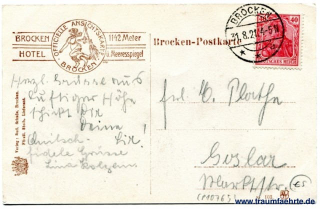– Details – Jahr: ca. 1920 Status: gelaufen 1921 Beschriftung vorne: Brocken, 1142 m ü. M. Beschriftung hinten: Brocken-Postkarte, Brocken Hotel, officielle Ansichtskarte, Brocken, 1142 Meter ü. Meeresspiegel, Dep. Nr. 103. R H, Verlag: Rud. Schade, Brocken. Fürstl. Stolb. Lieferant. Stempel: Brocken, * * a, 31.8.21.4-5N Hinweis: