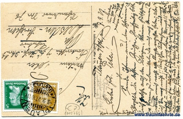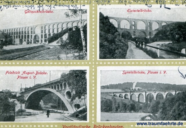– Details – Year: ca. 1925 Postal state: postally used 1927 Inscription front: Göltzschtalbrücke. Elstertalbrücke. Friedrich August-Brücke. Plauen i. V. Syratalbrücke, Plauen i. V. Vogtländlische Brückenbauten. Inscription back: L&Co. G, C. Hofkunstanstalt Löffler & Co., Greiz. Geschmacksmusterschutz. Postmark(s): Plauen (Vogtland), -8.9.27.10-11V. Please note: