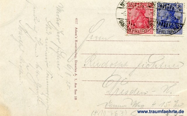 – Details – Year: ca. 1915 Postal state: postally used 1920 Inscription front: Sommerfrische Hetzdorf-Herrndorf, Post Niederschöna am Tharandter Wald gelegen Inscription back: 4317 Adam's Kunstverlag, Dresden A. 1, Am See 18 Postmark(s): 2x Niederschöna (Amtsh. Freiberg), -6.8.20.2-3N Please note: