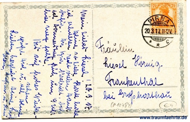 – Details – Jahr: ca. 1915 Status: gelaufen 1917 Beschriftung vorne: kein Text Beschriftung hinten: No 9(0)4, Wenau-Pastell, Wenau-Postkarte Patentamtl. Gesch. W & N, A E G Stempel: Pirna, c, 20.3.17.11-12V. Hinweis: