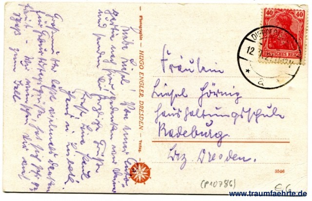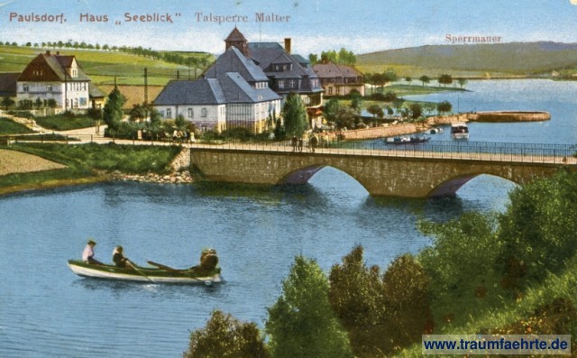 – Details – Jahr: ca. 1920 Status: gelaufen 1921 Beschriftung vorne: Paulsdorf. Haus Seeblick, Talsperre Malter, Sperrmauer Beschriftung hinten: Photographie – Hugo Engler Dresden – Verlag. HE, 3506 Stempel: Dippoldiswalde, * a *, 12.(9.)21.11-12V Hinweis: