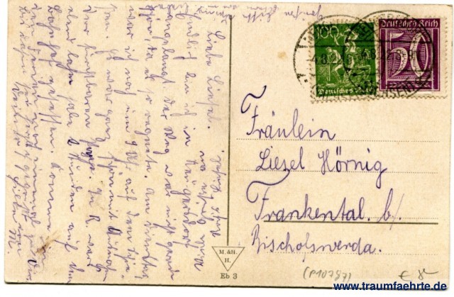 – Details – Year: ca. 1920 Postal state: postally used 1922 Inscription front: Ebersbach i. Sachsen, Humboldbaude, 71800 Inscription back: M. & H. H. Eb 3 Postmark(s): 2x Neugersdorf (Sachsen), 4.8.22 8-9N Please note: