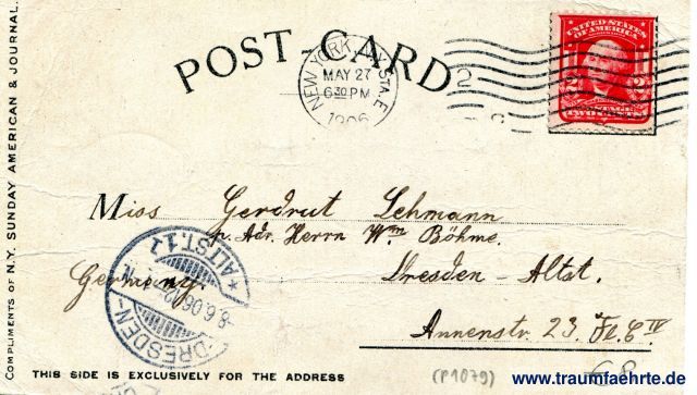 – Details – Jahr: 1906 Status: gelaufen 1906 Beschriftung vorne: Copyright, 1906, by American-Journal-Examiner. What the Earthquake did in half a minute. Beschriftung hinten: Post Card, This side is exclusively for the address, Compliments to N.Y. Sunday American & Journal Stempel: New York, N.Y. Sta. E, MAY 27, 6 30pm, 1906; Dresden-Altst. 1, 1, – 8.6.06 12-1-N.; ~~~ Hinweis: