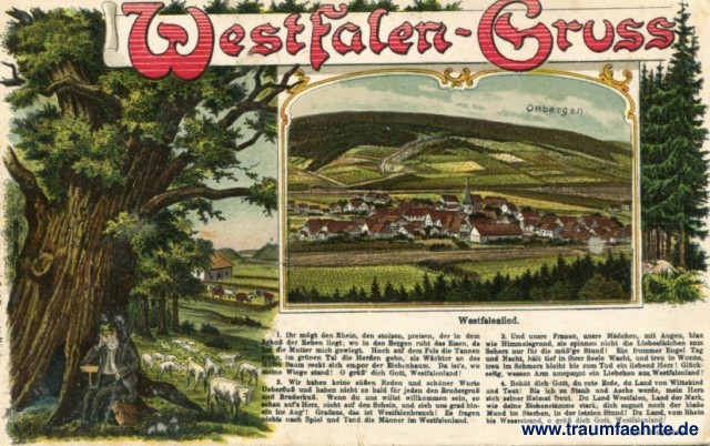 – Details – Jahr: ca. 1915 Status: gelaufen ohne Briefmarke (Feldpost), 1917 Beschriftung vorne: Westfalen-Gruss, Ottbergen. Entwurf des gesch. No 4444 II. Kunstanstalt Carl Thoericht, Münden. Westfalenlied. 1. Ihr mögt den Rhein, den stolzen, preisen, der in dem Schoß der Beben liegt; wo in den Bergen ruht das Eisen, da hat die Mutter mich gewiegt. Hoch auf dem Fels die Tannen stehn, im grünen Tal die Herden gehn, als Wächter an des Hofes Saum reckt sich empor der Eichenbaum. Da ist's wo meine Wiege stand! O grüß' dich Gott, Westfalenland! / 2. Wir haben keine süßen Reden und schöner Worte Ueberfluß und haben nicht so bald für jeden den Brudergruß und Bruderkuß. Wenn du uns willst willkommen sein, so schau auf's Herz, nicht auf den Schein, und sieh uns grad hinein ins Aug'! Gradaus, das ist Westfalenbrauch! Es fragen nichts nach Spiel und Tand, die Männer im Westfalenland. / 3. Und unsre Frauen, unsre Mädchen, mit Augen, blau wie Himmelsgrund, sie spinnen nicht die Liebesfädchen zum Sehers nur für die müß'ge Stund! Ein frommer Engel Tag und Nacht, hält tief in ihrer Seele Wacht, und treu in Wonne, treu in Schmerz bleibt bis zum Tod ein liebend Herz! Glückselig wessen Arm umspannt, ein Liebchen aus Westfalenland! / 4. Behüt dich Gott, du rote Erde, du Land von Wittekind und Teut! Bis ich zu Staub und Asche werde, mein Herz sich seiner Heimat freut. Du Land Westfalen, Land der Mark, wie deine Eichenstämme stark, dich segnet noch der blaße Mund im Sterben, in der letzten Stund! Du Land vom Rhein bis Weserstrand, o grüß dich Gott, Westfalenland! Emil Rittershaus. Beschriftung hinten: C. T. M. 7364 R.U. / O. Lu. Hof-Kunstanstalt Carl Thoericht, Hann. Münden Stempel: Paderborn, f, 16.3.17.7-8V. Hinweis: