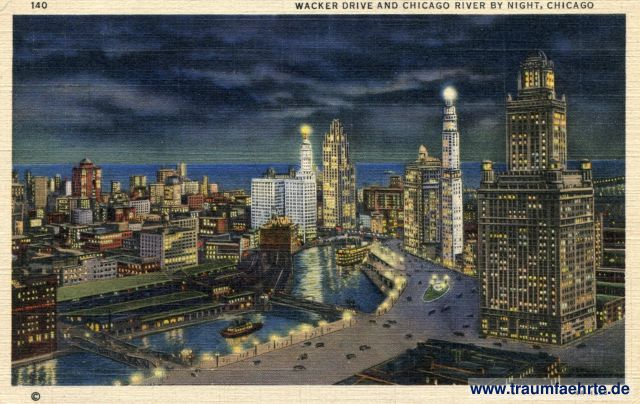 Schlagworte: Nacht, Wolkenkratzer, Schiffe, Brücken, Chicago River, Dampfschiffe, Lichter