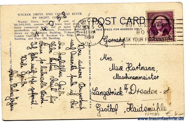 – Details – Jahr: 1934 Status: gelaufen 1938 Beschriftung vorne: 140 Wacker Drive and Chicago River by night, Chicago, ©, 4A-H358 Beschriftung hinten: Post Card, This space for address only, Eacker Drive and Chicago River by night, Chicago, Wacker Drive, built at a cost of about $8,000,000, consists of a lower level drive for heavy commercial traffic and an upper level for automobiles and pedestrians. Prominent buildings shown are the Wrigley Building, Tribune Tower, London Guarantee & Accident Co. Bldg., Mather Building, and Pure Oil Building. The (T. O.) Stoll Co., Chicago , Ill. C. T. Art Colortone, made only by Curt Teich & Co., Inc., Chicago, U.S.A. Stempel: 13 Chicago, Ill. NOV 5, 11 pm, 1938; Buy U.S. Savings, Bonds, Ask your postmaster Hinweis: