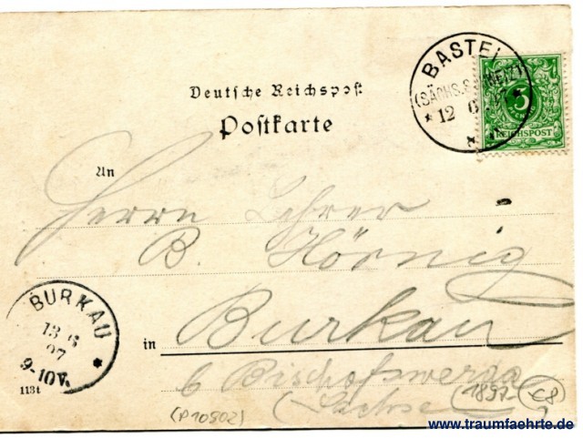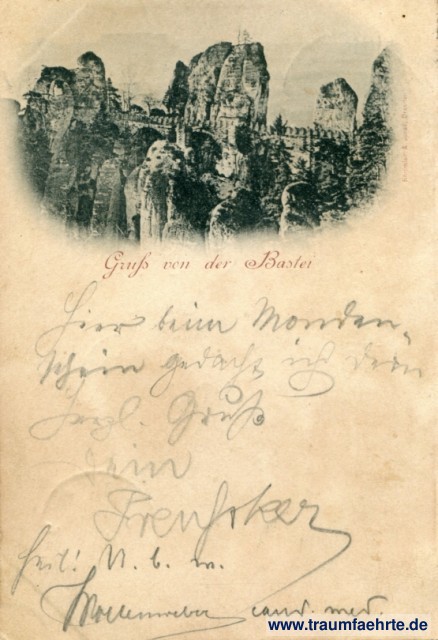 – Details – Jahr: ca. 1895 Status: gelaufen 1897 Beschriftung vorne: Gruß von der Bastei Beschriftung hinten: Deutsche Reichspost, Postkarte, An ... in ... 113t Stempel: Bastei (Sächs. Schweiz), 12 6 97, 8-9N.; Burkau, 13 6 97, 9-10V. Hinweis: