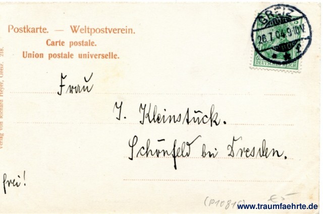 Beschriftung hinten: Postkarte. – Weltpostverein. Carte postale. Union postale universelle. Verlag von Richard Heyer, Greiz. 218.