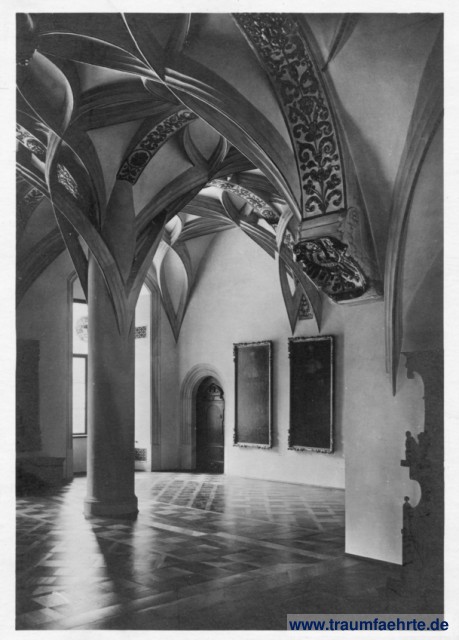 monochrome photograph – inner view of former St. Erasmus chapel with columns and paintings