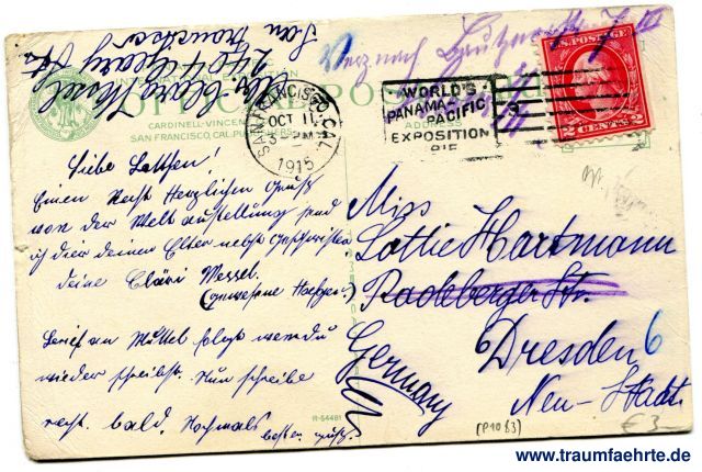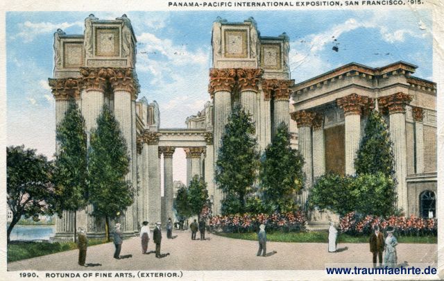 – Details – Jahr: 1915 Status: gelaufen 1915 Beschriftung vorne: Panama-Pacific International Exposition, San Francisco 1915. 1990. Rotunda of Fine Arts, (Exterior.) Beschriftung hinten: Panama-Pacific International Exposition, Official Post Card, Cardinell-Vincent Co, San Francisco, Ca. Publishers, Address, R-54481, C.T. American Art Stempel: World's Panama-Pacific Exposition 1915; San Francisco, Cal. OCT 11, 3 – pm, 1915 Hinweis:
