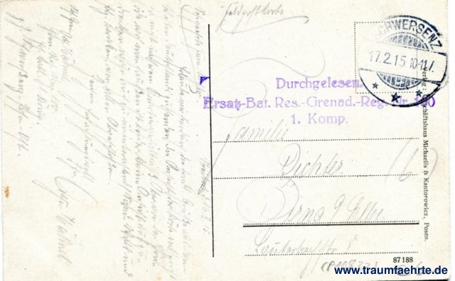 – Details – Jahr: ca. 1915 Status: gelaufen ohne Briefmarke (Feldpost), 1915 Beschriftung vorne: Posen, Stadttheater. Königl. Ansiedelungskommission. Paulikirche. Beschriftung hinten: Verlag: Geschäftshaus Michaelis & Kantorowicz, Posen. 87188 Stempel: Schwersenz, 17.2.15. 10-11V., * * *; Durchgelesen. Ersatz-Bat. Res.-Grenad.-Reg. Nr. 100, 1. Komp. Hinweis: