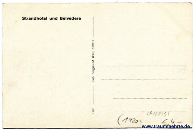 – Details – Year: ca. 1920 Postal state: postally unused Inscription front: Seebad Misdroy, Belvedere, Strandhotel Inscription back: Strandhotel und Belvedere, r 89, 1356. Siegmund Weil, Stettin Postmark(s): none Please note: