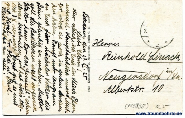 – Details – Jahr: ca. 1920 Status: gelaufen 1925, Briefmarke entfernt Beschriftung vorne: Blick auf die Pfaueninsel Beschriftung hinten: 1925 Kunstverlag W. Meyerheim, Berlin O. 17. 3006 Stempel: (...), 2(...) Hinweis:
