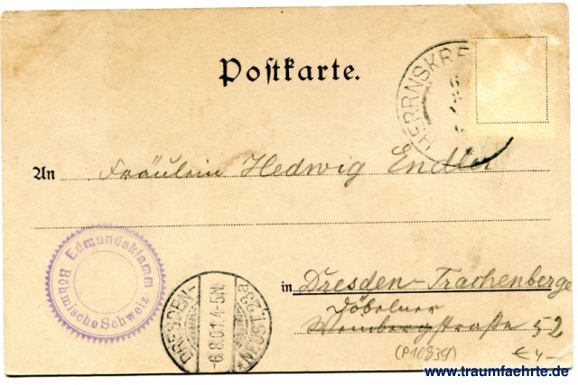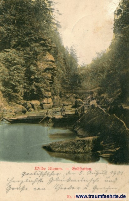 – Details – Jahr: ca. 1900 Status: gelaufen 1901, Briefmarke entfernt Beschriftung vorne: Wilde Klamm. – Endstation. No. 138. T.B. & S- A-G- vorm. August Hempel, Tetschen Beschriftung hinten: Postkarte. An ... in ... Stempel: Edmundsklamm, Böhmische Schweiz; Herrenskre(tchen), (...); Dresden-Neust. 23, a, -6.8.01. 4-5N. Hinweis: