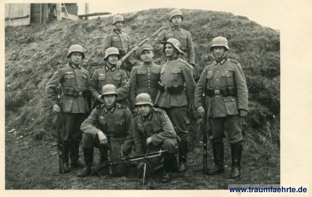 Schwarzweißfotografie – Gruppenbild: Wehrmachtssoldaten mit Helmen, Uniformen und Gewehren