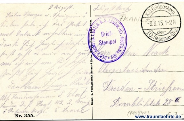 – Details – Jahr: ca. 1910 Status: gelaufen ohne Briefmarke (Feldpost), 1915 Beschriftung vorne: Montmédy. Beschriftung hinten: Nr. 355. Kunst- u. Verlagsanstalt Schaar & Dathe, Komm. Ges. a. Akt., Trier. Stempel: Der 2. Komp. D. I. Batls. K. S. Landw.-Inf.-Regts. No. 102; K.D. Feldpostexp. Der 10. Reserve-Div. -8.8.15. 1-2N Hinweis: