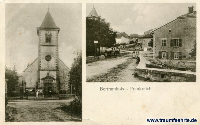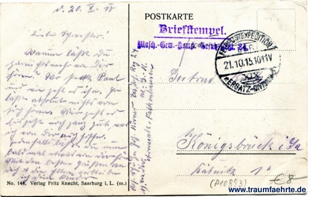 – Details – Year: ca. 1910 Postal state: postally used without stamp (military mail), 1915 Inscription front: Bertrambois – Frankreich Inscription back: Postkarte, No. 144. Verlag Fritz Knecht, Saarburg i. L. (m.) Postmark(s): Briefstempel. Masch.-Gew.-Komp. Ersatz-Regt. 24.; Feldpostexpedition, XIX. Ersatz-Division, b, 21.10.15.10-11V Please note: