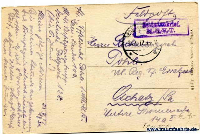 – Details – Jahr: ca. 1915 Status: gelaufen ohne Briefmarke (Feldpost), 1917 Beschriftung vorne: Saarburg i. Lothr. – Hospital St. Nikolaus Beschriftung hinten: Verlag H. Senetik, Saarburg, 31e 16 Stempel: Soldatenbrief, M.-G.-V.-T.; K.D. Feldpost(...), a, 24.5.17 9-10 V Hinweis: