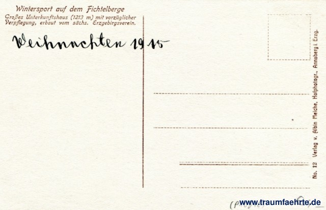 – Details – Year: 1915 Postal state: postally unused Inscription front: no text Inscription back: Wintersport auf dem Fichtelberge, Großes Unterkunftshaus (1213 m) mit vorzüglicher Verpflegung, erbaut vom sächs. Erzgebirgsverein. No. 12 Verlag v. Albin Meiche, Hofphotogr., Annaberg i. Erzg. Postmark(s): none Please note: