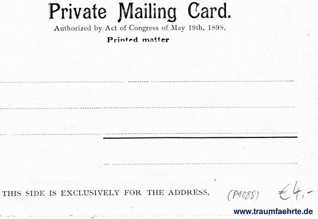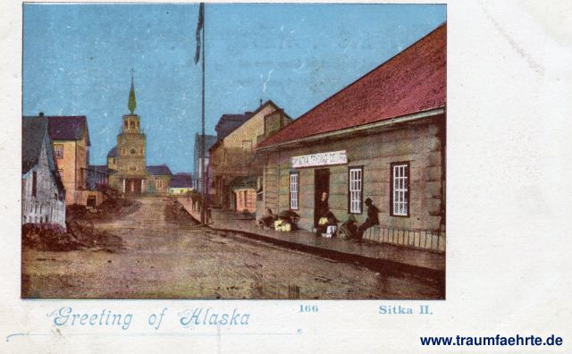 – Details – Year: ca. 1900 Postal state: postally unused Inscription front: Greeting of Alaska, 166, Sitka II. Sitka Trading Co. ... Inscription back: Private Mailing Card. Authorized by Act of Congress of May 19th, 1898. Printed matter, This side is exclusively for the address. Postmark(s): none Please note: